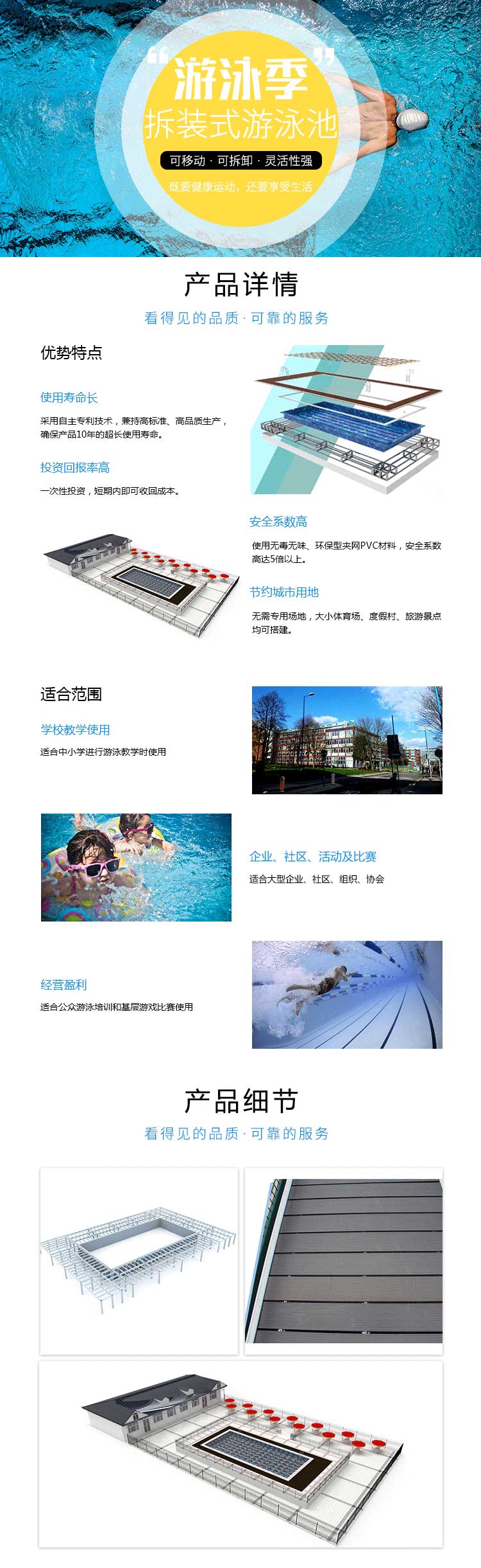 本公司對(duì)拆裝式泳池進(jìn)行研發(fā)制造,至今已積累豐富經(jīng)驗(yàn),掌握和攻克了大量的技術(shù)難關(guān),現(xiàn)在公司產(chǎn)品的構(gòu)造、工藝已達(dá)到了國(guó)內(nèi)外先進(jìn)水平。并以產(chǎn)品安全可靠的品質(zhì)、溫馨優(yōu)質(zhì)的售后、全面貼心的配套服務(wù)獲得客戶的一致好評(píng)。